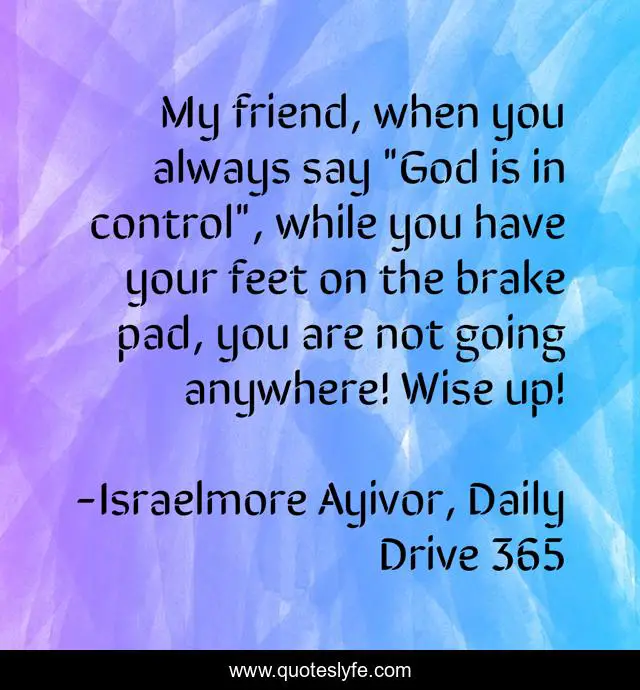 This page presents the quote "My friend, when you always say "God is in control", while you have your feet on the brake pad, you are not going anywhere! Wise up!". Author of this quote is Israelmore Ayivor, Daily Drive 365. This quote is about control, wise-up, food-for-thought, wise, obey, god, be-wise, obedience, brake-pad,.