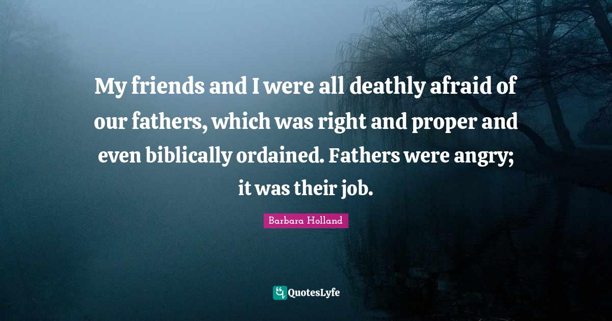 This page presents the quote "My friends and I were all deathly afraid of our fathers, which was right and proper and even biblically ordained. Fathers were angry; it was their job.". Author of this quote is Barbara Holland. This quote is about father, angry, my friends, jobs,.