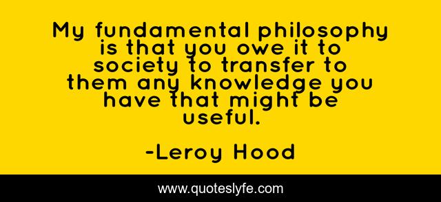 This page presents the quote "My fundamental philosophy is that you owe it to society to transfer to them any knowledge you have that might be useful.". Author of this quote is Leroy Hood. This quote is about society, philosophy,.