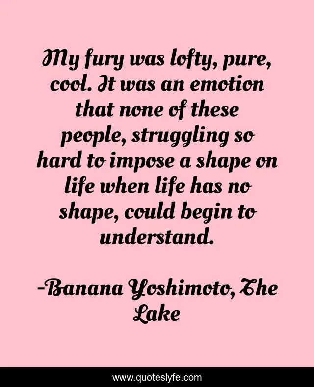 This page presents the quote "My fury was lofty, pure, cool. It was an emotion that none of these people, struggling so hard to impose a shape on life when life has no shape, could begin to understand.". Author of this quote is Banana Yoshimoto, The Lake. .