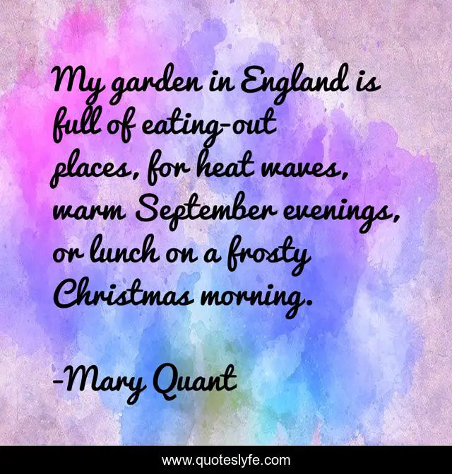 This page presents the quote "My garden in England is full of eating-out places, for heat waves, warm September evenings, or lunch on a frosty Christmas morning.". Author of this quote is Mary Quant. This quote is about lunch, garden, morning,.