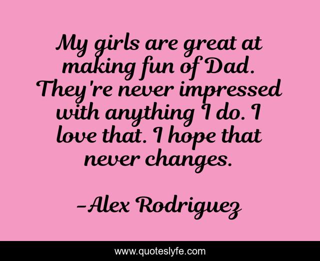 This page presents the quote "My girls are great at making fun of Dad. They're never impressed with anything I do. I love that. I hope that never changes.". Author of this quote is Alex Rodriguez. This quote is about great, love, hope, affection,.