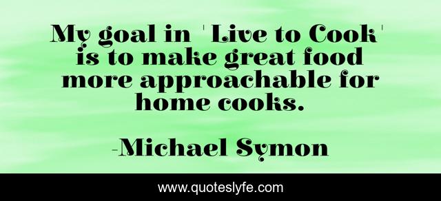 This page presents the quote "My goal in 'Live to Cook' is to make great food more approachable for home cooks.". Author of this quote is Michael Symon. This quote is about home, great, goal,.