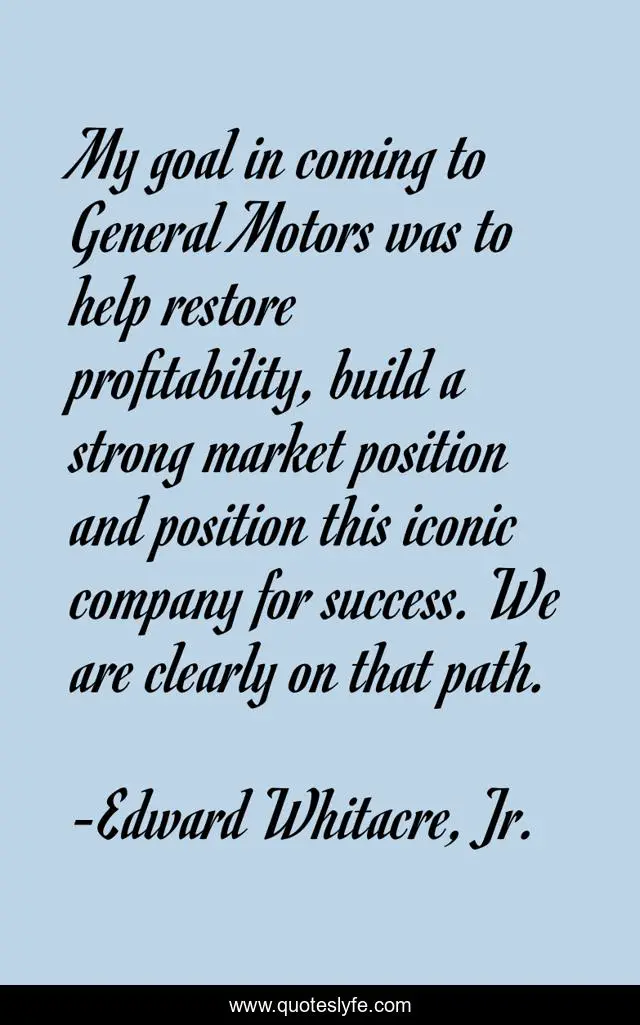 This page presents the quote "My goal in coming to General Motors was to help restore profitability, build a strong market position and position this iconic company for success. We are clearly on that path.". Author of this quote is Edward Whitacre, Jr.. This quote is about path, strong, goal,.