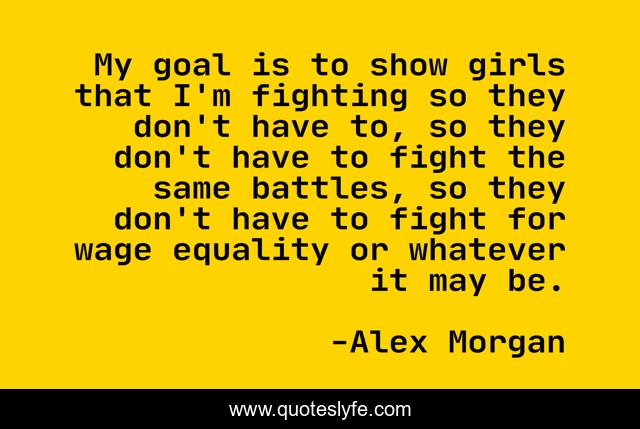 This page presents the quote "My goal is to show girls that I'm fighting so they don't have to, so they don't have to fight the same battles, so they don't have to fight for wage equality or whatever it may be.". Author of this quote is Alex Morgan. This quote is about goal, fighting, fight,.