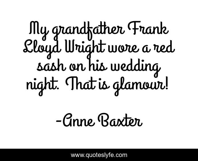 This page presents the quote "My grandfather Frank Lloyd Wright wore a red sash on his wedding night. That is glamour!". Author of this quote is Anne Baxter. This quote is about night, red, grandfather,.