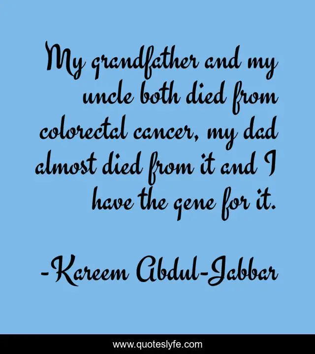 This page presents the quote "My grandfather and my uncle both died from colorectal cancer, my dad almost died from it and I have the gene for it.". Author of this quote is Kareem Abdul-Jabbar. This quote is about uncle, cancer, grandfather,.