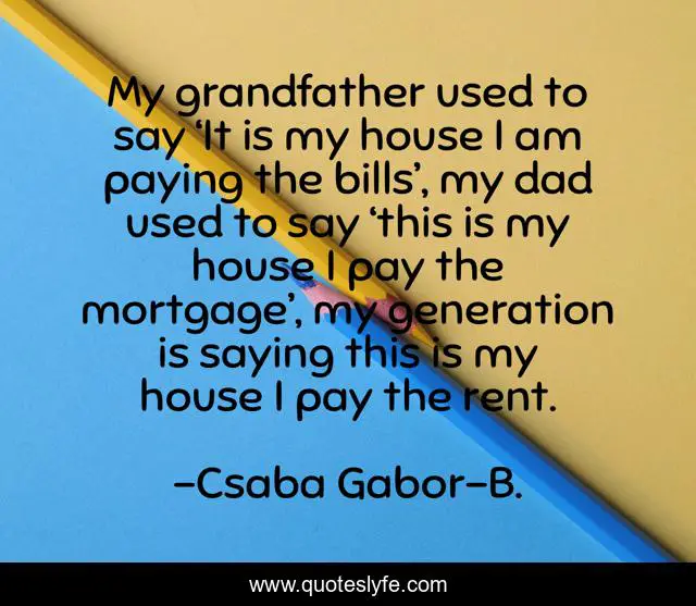 This page presents the quote "My grandfather used to say ‘It is my house I am paying the bills’, my dad used to say ‘this is my house I pay the mortgage’, my generation is saying this is my house I pay the rent.". Author of this quote is Csaba Gabor-B.. This quote is about bills, finance, mortgage, people, generation, money, house, home, property,.