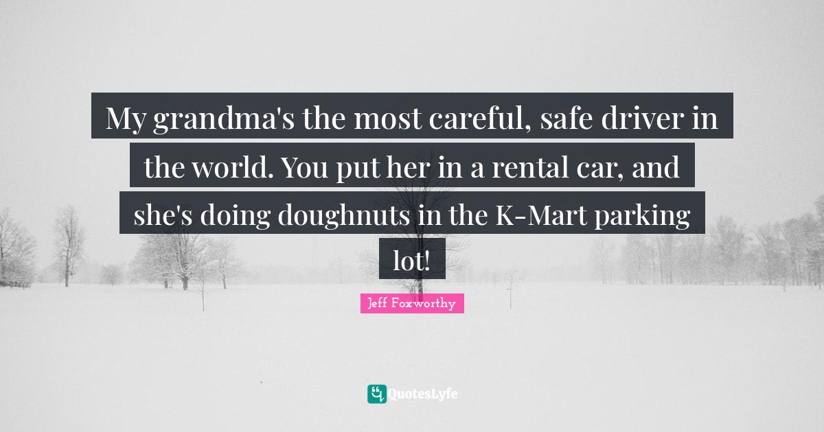 This page presents the quote "My grandma's the most careful, safe driver in the world. You put her in a rental car, and she's doing doughnuts in the K-Mart parking lot!". Author of this quote is Jeff Foxworthy. This quote is about careful, parking lot, safe, grandma, my grandma, car, grandparent, world,.