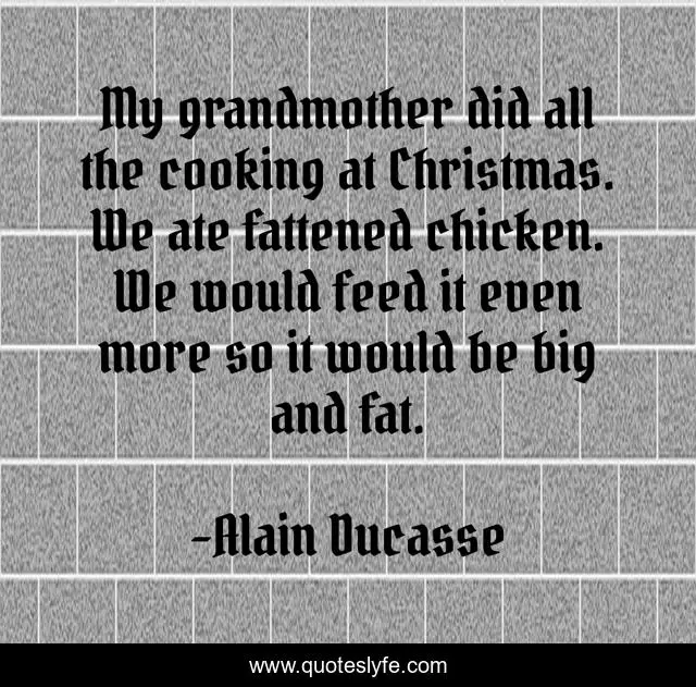 This page presents the quote "My grandmother did all the cooking at Christmas. We ate fattened chicken. We would feed it even more so it would be big and fat.". Author of this quote is Alain Ducasse. This quote is about chicken, cooking, fat,.