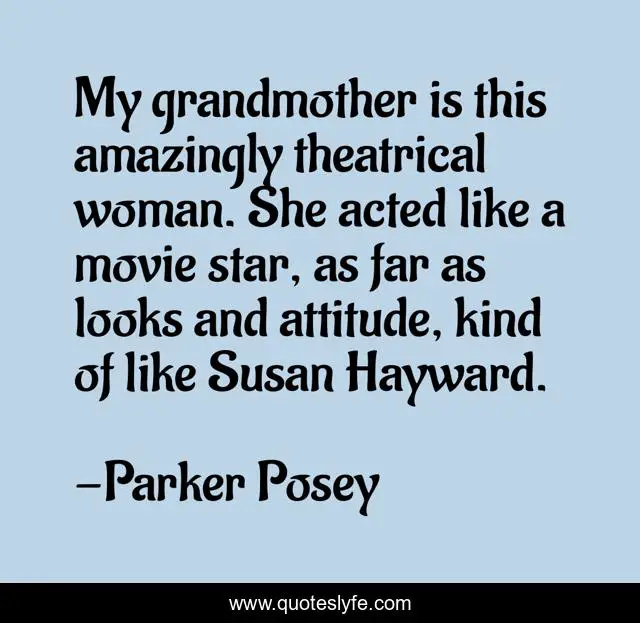 This page presents the quote "My grandmother is this amazingly theatrical woman. She acted like a movie star, as far as looks and attitude, kind of like Susan Hayward.". Author of this quote is Parker Posey. This quote is about grandmother, woman, she,.