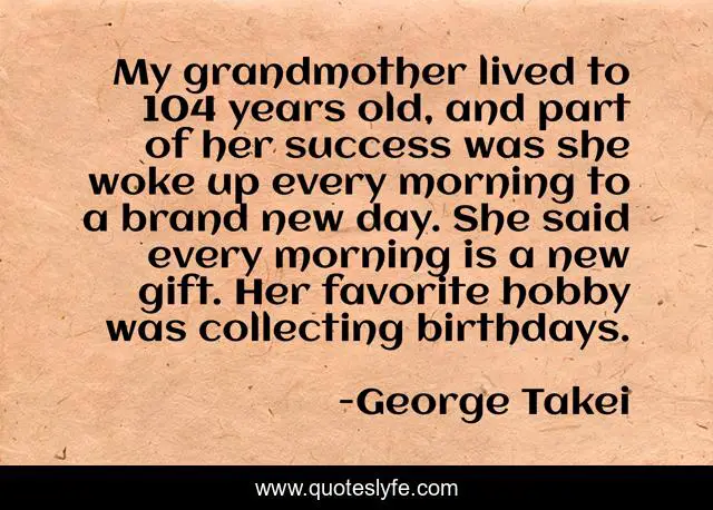 This page presents the quote "My grandmother lived to 104 years old, and part of her success was she woke up every morning to a brand new day. She said every morning is a new gift. Her favorite hobby was collecting birthdays.". Author of this quote is George Takei. This quote is about success, day, gift,.