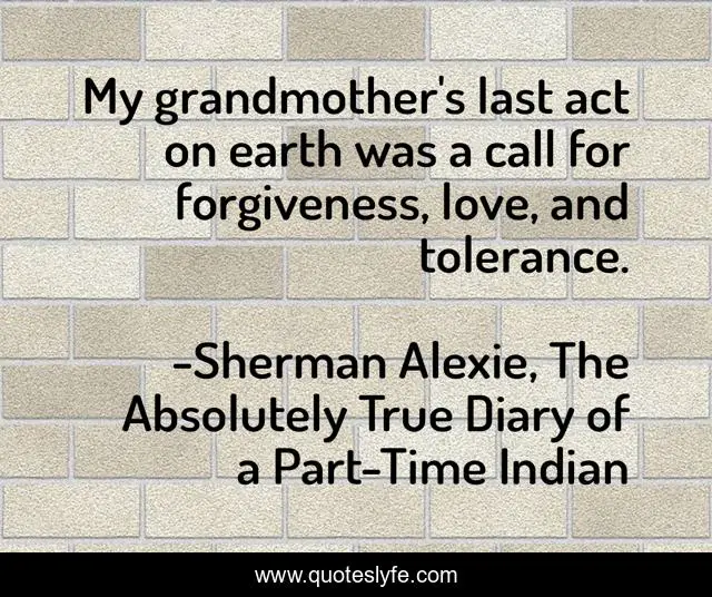 This page presents the quote "My grandmother's last act on earth was a call for forgiveness, love, and tolerance.". Author of this quote is Sherman Alexie, The Absolutely True Diary of a Part-Time Indian. This quote is about love, forgiveness, act, grandmother, earth, last, tolerance, affection,.