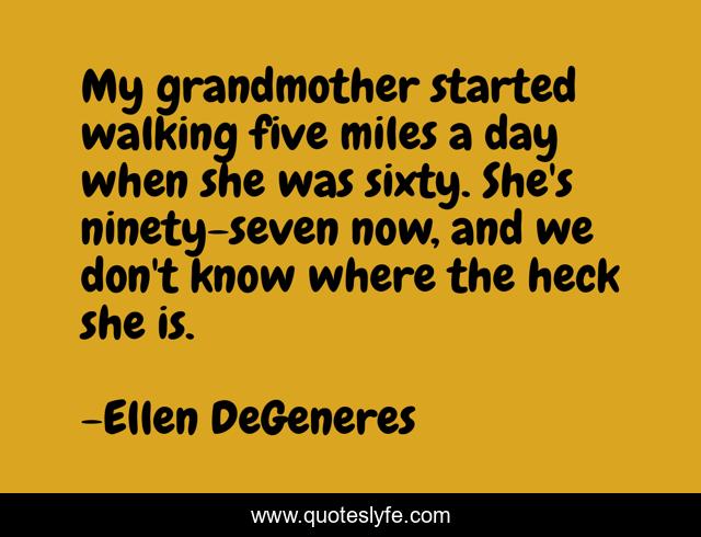 This page presents the quote "My grandmother started walking five miles a day when she was sixty. She's ninety-seven now, and we don't know where the heck she is.". Author of this quote is Ellen DeGeneres. This quote is about walking, humor, family, grandparents, age, grandmothers, exercise,.