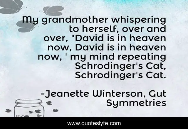 This page presents the quote "My grandmother whispering to herself, over and over, "David is in heaven now, David is in heaven now, ' my mind repeating Schrodinger's Cat, Schrodinger's Cat.". Author of this quote is Jeanette Winterson, Gut Symmetries. .