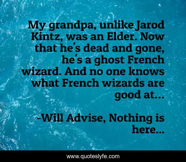 This page presents the quote "My grandpa, unlike Jarod Kintz, was an Elder. Now that he's dead and gone, he's a ghost French wizard. And no one knows what French wizards are good at…". Author of this quote is Will Advise, Nothing is here.... This quote is about ghost, gone, love, affection, family, passing-on, wizard, jarod-kintz, grandfather,.