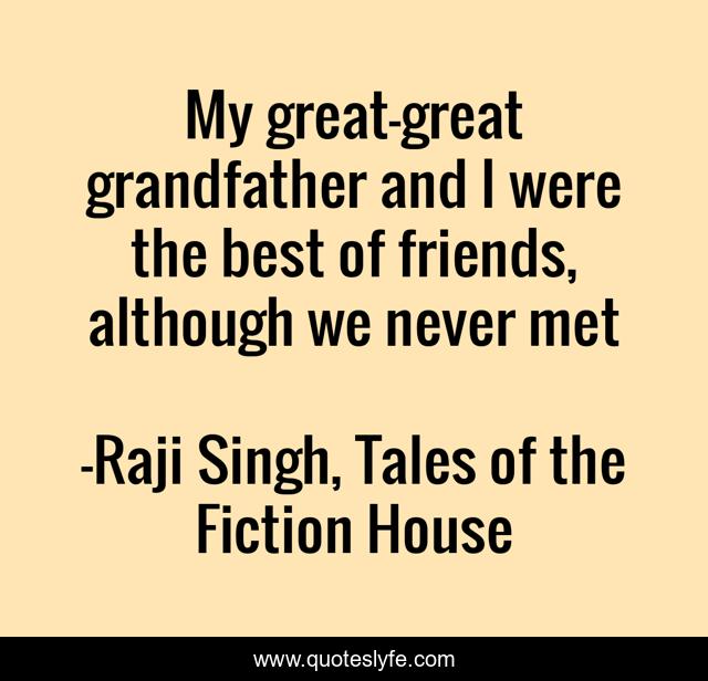 This page presents the quote "My great-great grandfather and I were the best of friends, although we never met". Author of this quote is Raji Singh, Tales of the Fiction House. This quote is about humor, alternative-american-history, satire, fiction, drama, folk-tales, whimsey,.