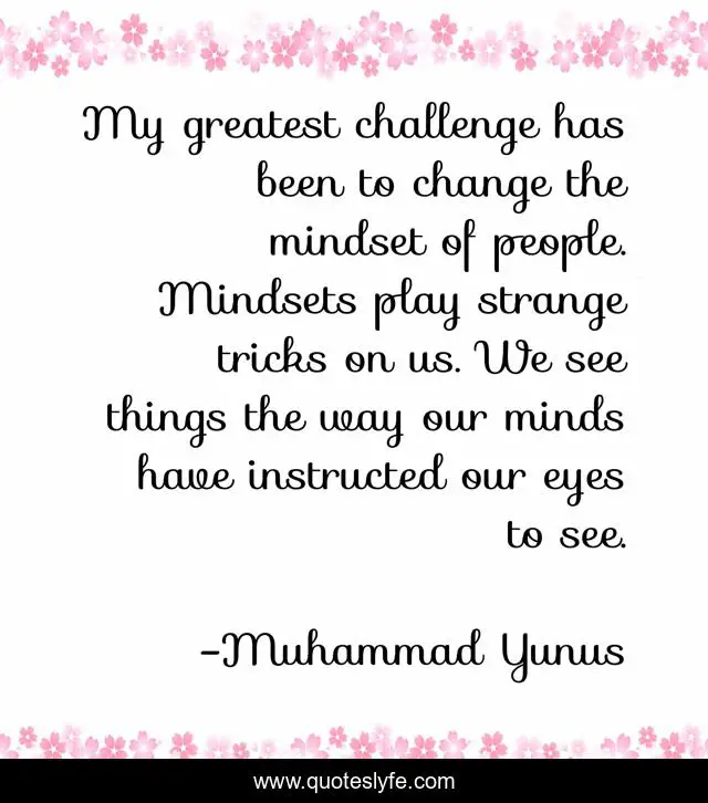 This page presents the quote "My greatest challenge has been to change the mindset of people. Mindsets play strange tricks on us. We see things the way our minds have instructed our eyes to see.". Author of this quote is Muhammad Yunus. This quote is about eyes, challenge, greatest,.