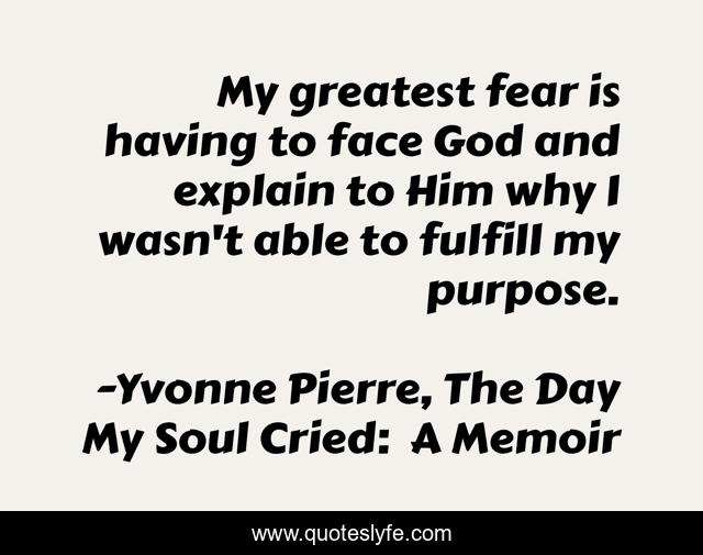 This page presents the quote "My greatest fear is having to face God and explain to Him why I wasn't able to fulfill my purpose.". Author of this quote is Yvonne Pierre, The Day My Soul Cried: A Memoir. This quote is about faith, life, god, choices, purpose, fear,.
