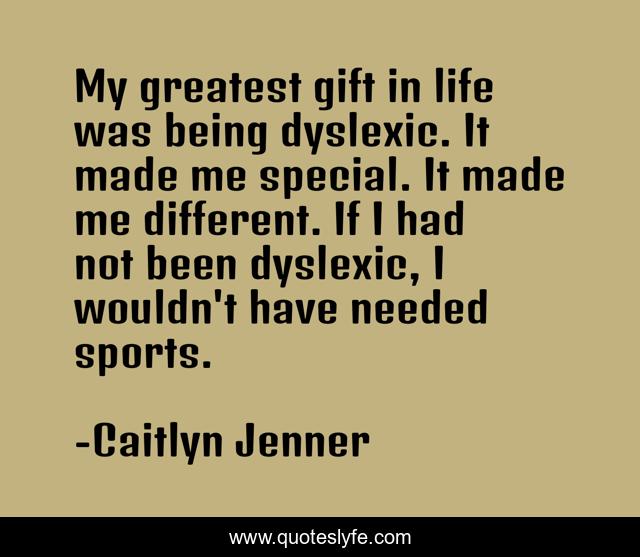 This page presents the quote "My greatest gift in life was being dyslexic. It made me special. It made me different. If I had not been dyslexic, I wouldn't have needed sports.". Author of this quote is Caitlyn Jenner. This quote is about me, life, gift,.