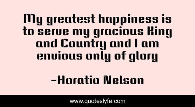 This page presents the quote "My greatest happiness is to serve my gracious King and Country and I am envious only of glory". Author of this quote is Horatio Nelson. This quote is about soul, greatest,.