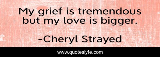 This page presents the quote "My grief is tremendous but my love is bigger.". Author of this quote is Cheryl Strayed. This quote is about loss, death, advice, dear-sugar, tiny-beautiful-things, cheryl-strayed,.