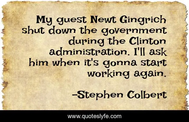 This page presents the quote "My guest Newt Gingrich shut down the government during the Clinton administration. I'll ask him when it's gonna start working again.". Author of this quote is Stephen Colbert. This quote is about newt-gingrich, government-shutdown, humour, twitter, bill-clinton, united-states, politics, 2012,.