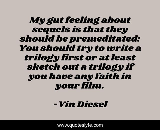 This page presents the quote "My gut feeling about sequels is that they should be premeditated: You should try to write a trilogy first or at least sketch out a trilogy if you have any faith in your film.". Author of this quote is Vin Diesel. This quote is about try, gut,.