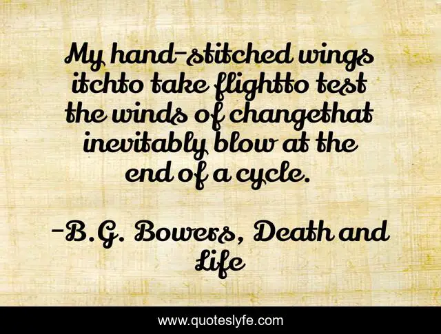 This page presents the quote "My hand-stitched wings itchto take flightto test the winds of changethat inevitably blow at the end of a cycle.". Author of this quote is B.G. Bowers, Death and Life. This quote is about evolution, recovery, survivor, journey, journey-of-life, inspirational, personal-development, enthusiasm, cycles,.