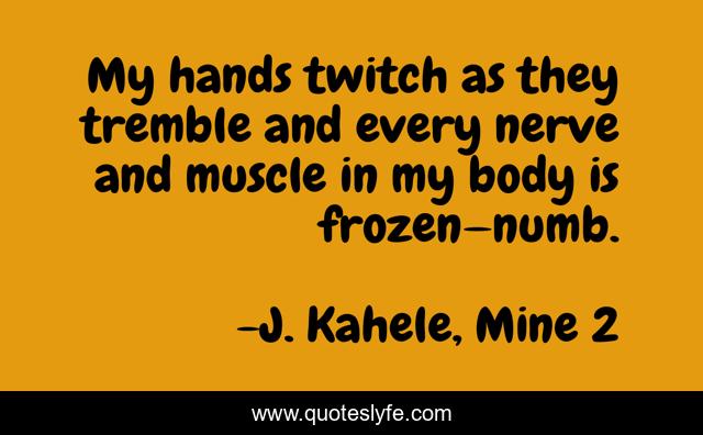 This page presents the quote "My hands twitch as they tremble and every nerve and muscle in my body is frozen—numb.". Author of this quote is J. Kahele, Mine 2. This quote is about love, abuse, romance-thriller-suspense, domestic-violence, book, affection,.