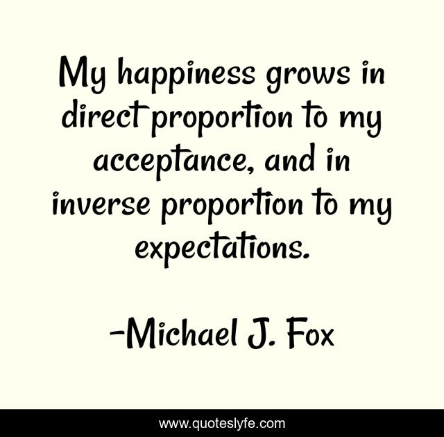 This page presents the quote "My happiness grows in direct proportion to my acceptance, and in inverse proportion to my expectations.". Author of this quote is Michael J. Fox. This quote is about enthusiasm, acceptance, happiness, inspirational,.