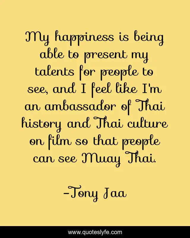 This page presents the quote "My happiness is being able to present my talents for people to see, and I feel like I'm an ambassador of Thai history and Thai culture on film so that people can see Muay Thai.". Author of this quote is Tony Jaa. This quote is about culture, history, people,.