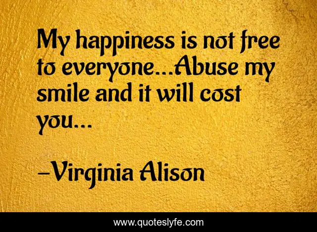 This page presents the quote "My happiness is not free to everyone...Abuse my smile and it will cost you...". Author of this quote is Virginia Alison. This quote is about smile, free, happiness,.
