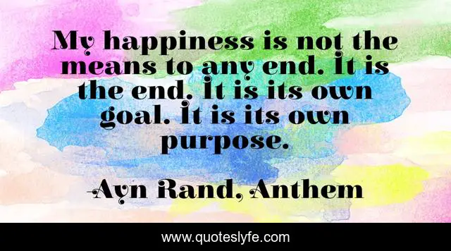 This page presents the quote "My happiness is not the means to any end. It is the end. It is its own goal. It is its own purpose.". Author of this quote is Ayn Rand, Anthem. This quote is about enthusiasm, salvation, happiness, inspirational,.