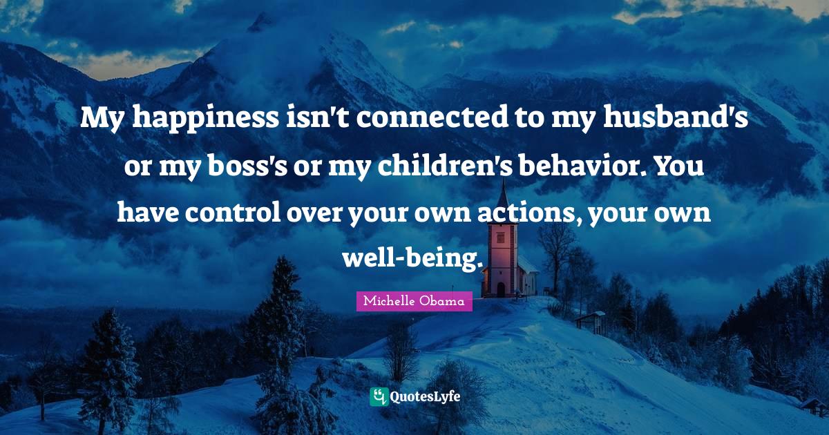 This page presents the quote "My happiness isn't connected to my husband's or my boss's or my children's behavior. You have control over your own actions, your own well-being.". Author of this quote is Michelle Obama. This quote is about my husband, behavior, connected, my children, happiness, husband, boss, children,.