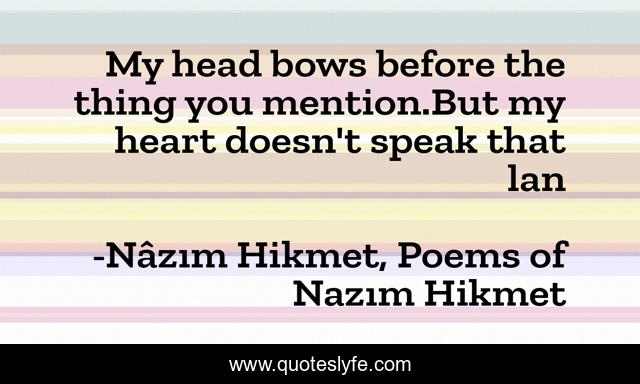 This page presents the quote "My head bows before the thing you mention.But my heart doesn't speak that lan". Author of this quote is Nâzım Hikmet, Poems of Nazım Hikmet. This quote is about feeling, knowledge,.