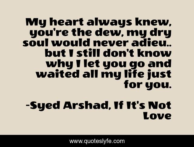 This page presents the quote "My heart always knew, you're the dew, my dry soul would never adieu.. but I still don't know why I let you go and waited all my life just for you.". Author of this quote is Syed Arshad, If It's Not Love. This quote is about romance, lovers, poems-cute,.