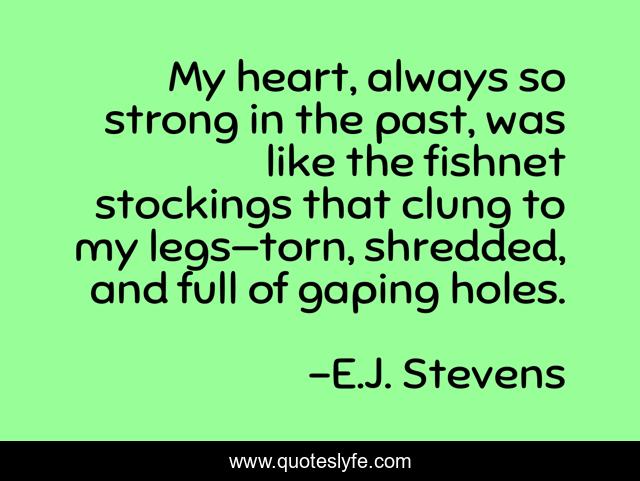 This page presents the quote "My heart, always so strong in the past, was like the fishnet stockings that clung to my legs—torn, shredded, and full of gaping holes.". Author of this quote is E.J. Stevens. This quote is about teen, spirit-guide-series, ya, brush-with-death, paranormal, young-adult, yuki,.