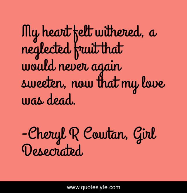 This page presents the quote "My heart felt withered, a neglected fruit that would never again sweeten, now that my love was dead.". Author of this quote is Cheryl R Cowtan, Girl Desecrated. This quote is about death-of-a-loved-one, heartbreak, dying-inside, grief-and-loss, loss-of-love,.