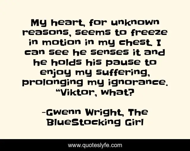 This page presents the quote "My heart, for unknown reasons, seems to freeze in motion in my chest. I can see he senses it and he holds his pause to enjoy my suffering, prolonging my ignorance. “Viktor, what?". Author of this quote is Gwenn Wright, The BlueStocking Girl. This quote is about mystery, dark, viktor, secrets, romance, gothic, gwenn-wright, family-saga, bluestocking-girl,.