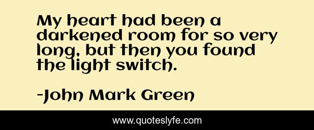 This page presents the quote "My heart had been a darkened room for so very long, but then you found the light switch.". Author of this quote is John Mark Green. This quote is about relationships, heart, confidence, love, positive, healing, light, affection,.