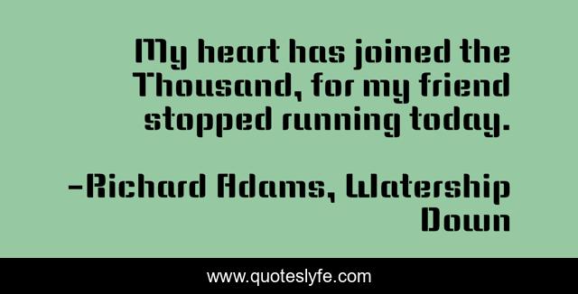 This page presents the quote "My heart has joined the Thousand, for my friend stopped running today.". Author of this quote is Richard Adams, Watership Down. This quote is about grief, loss, death,.