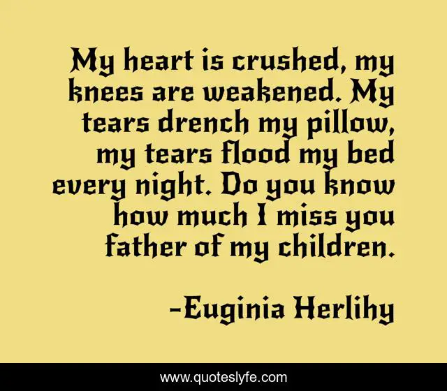 This page presents the quote "My heart is crushed, my knees are weakened. My tears drench my pillow, my tears flood my bed every night. Do you know how much I miss you father of my children.". Author of this quote is Euginia Herlihy. .