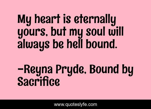 This page presents the quote "My heart is eternally yours, but my soul will always be hell bound.". Author of this quote is Reyna Pryde, Bound by Sacrifice. This quote is about hell, sacrifice, love, soul, affection,.