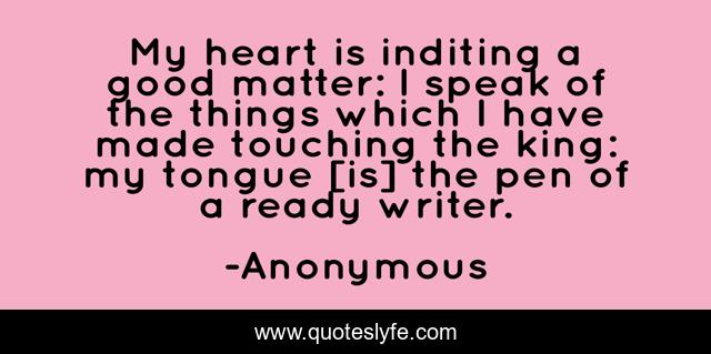 This page presents the quote "My heart is inditing a good matter: I speak of the things which I have made touching the king: my tongue [is] the pen of a ready writer.". Author of this quote is Anonymous. This quote is about enthusiasm, writer, inspirational, psalms, bible,.