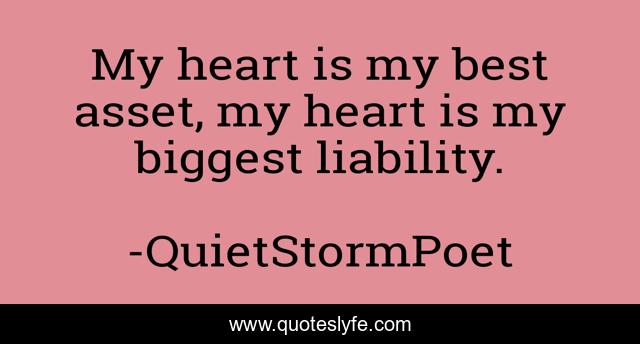 This page presents the quote "My heart is my best asset, my heart is my biggest liability.". Author of this quote is QuietStormPoet. This quote is about heartache, heart, love, heartbreak, inspirational, enthusiasm, affection, self-esteem,.