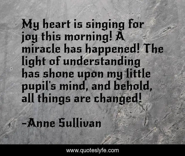 This page presents the quote "My heart is singing for joy this morning! A miracle has happened! The light of understanding has shone upon my little pupil's mind, and behold, all things are changed!". Author of this quote is Anne Sullivan. This quote is about light, morning, joy,.