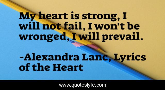 This page presents the quote "My heart is strong, I will not fail, I won't be wronged, I will prevail.". Author of this quote is Alexandra Lanc, Lyrics of the Heart. This quote is about lyrics-of-the-heart, novellas, poetry, ya-fiction, real-life, inspirational, enthusiasm, real-life-struggle,.