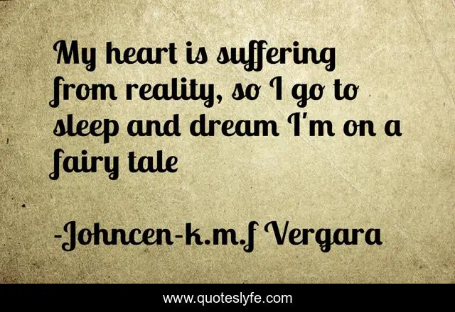 This page presents the quote "My heart is suffering from reality, so I go to sleep and dream I'm on a fairy tale". Author of this quote is Johncen-k.m.f Vergara. This quote is about broken-heart, hard-to-move-on, truth-of-life, reality,.