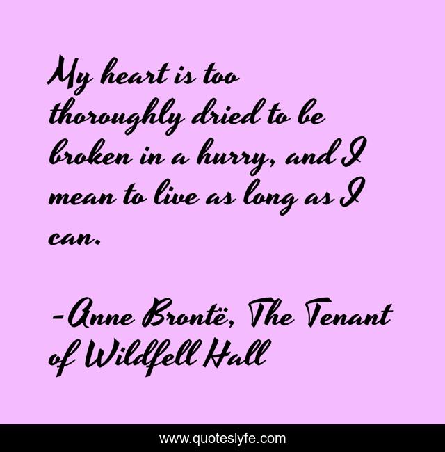 This page presents the quote "My heart is too thoroughly dried to be broken in a hurry, and I mean to live as long as I can.". Author of this quote is Anne Brontë, The Tenant of Wildfell Hall. This quote is about heart, life, heartbreak,.